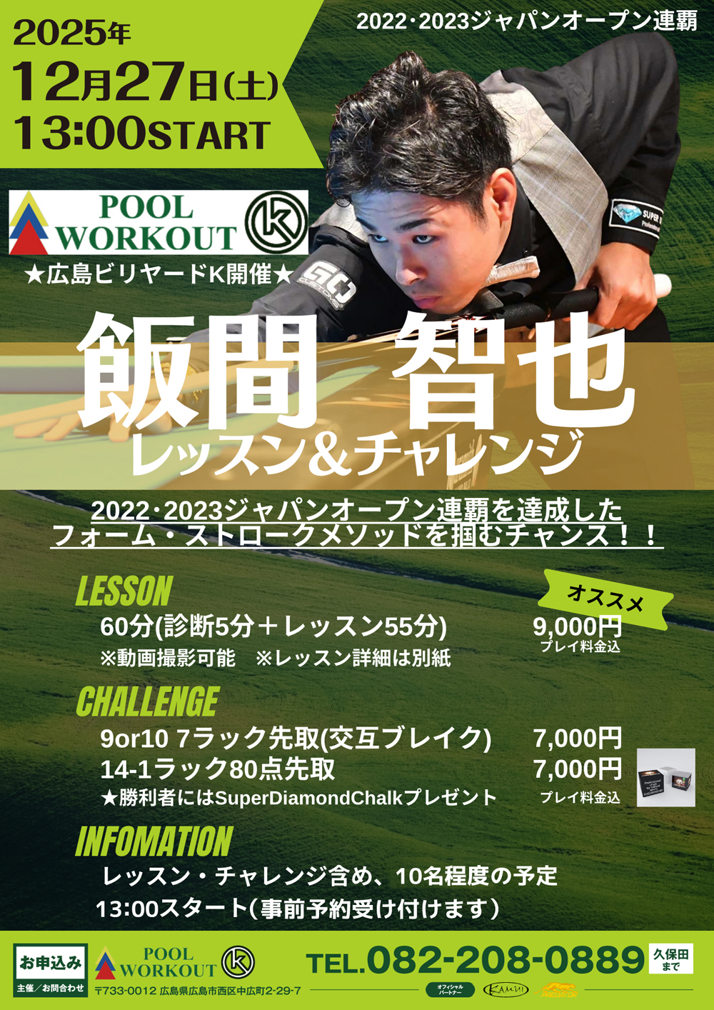 2022・2023ジャパンオープンを連破したあのJPBAトッププロ飯間智也氏が、ビリヤードK(西区中広)に!