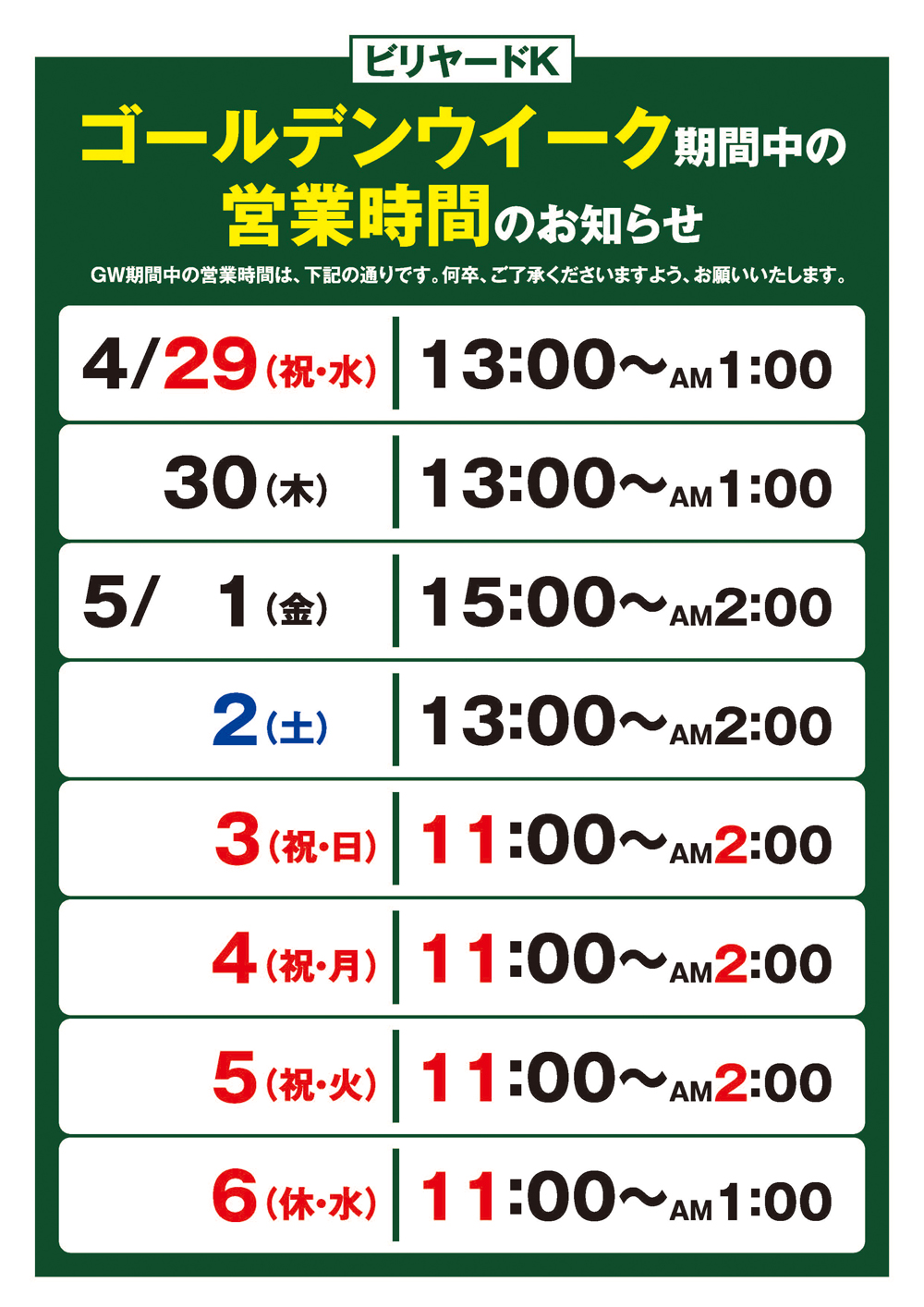 ビリヤードK ゴールデンウィークの営業時間のお知らせ