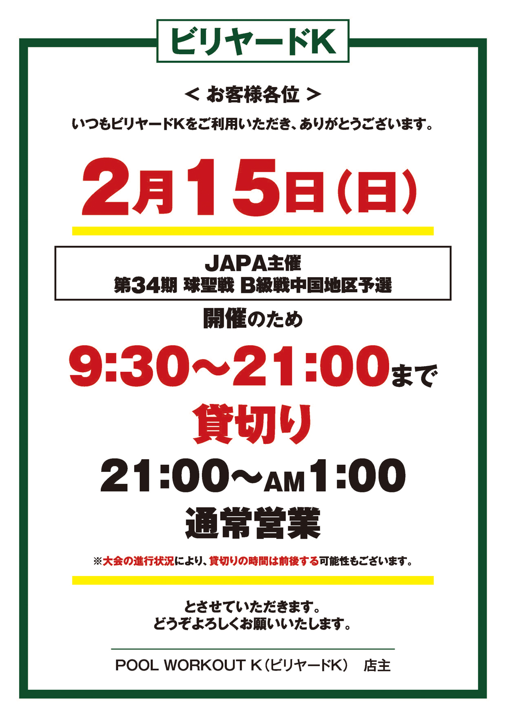 誠に勝手ではございますが、2月15日(日)は「第34期 球聖戦 B級戦中国地区予選」開催のため、一部貸切りとさせていただきます。