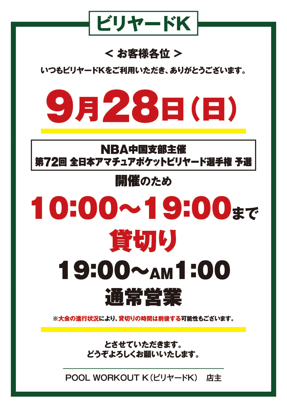 ビリヤードK「9月28日(日)一部貸切り」のお知らせ