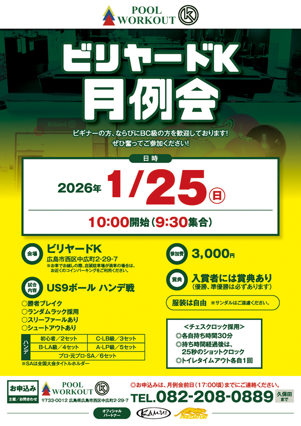 ビリヤードKビリヤードK-月例会「2026年1月」のご案内